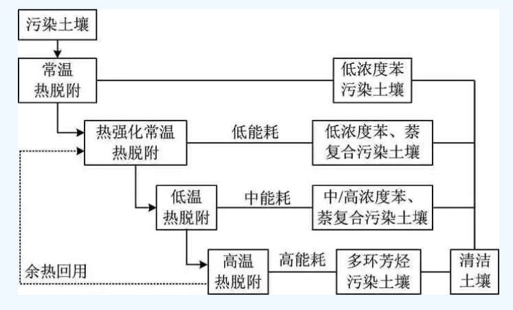 減少能源消耗和提倡使用破壞或降解污染物的修復(fù)技術(shù)是綠色可持續(xù)修復(fù)的原則,采用原地異位修復(fù);在修復(fù)技術(shù)上,采用逐級(jí)熱脫附集成技術(shù)。對(duì)于低濃度苯污染土壤采用常溫?zé)崦摳郊夹g(shù);對(duì)于低濃度苯、萘復(fù)合污染土壤采用低能耗的熱強(qiáng)化常溫?zé)崦摳郊夹g(shù);對(duì)于中/高濃度苯、萘復(fù)合污染土壤采用中能耗的低溫?zé)崦摳郊夹g(shù);對(duì)于多環(huán)芳烴污染土壤采用高能耗的高溫?zé)崦摳郊夹g(shù);利用高溫?zé)崦摳降挠酂徇M(jìn)行熱強(qiáng)化常溫?zé)崦摳剑瑢?shí)現(xiàn)余熱回用,提高能源利用效率。通過采用精細(xì)化熱脫附集成修復(fù)技術(shù),大幅減少了高溫?zé)崦摳郊夹g(shù)處理的土方量,降低了能耗和環(huán)境足跡,提高了能源利用效率。
